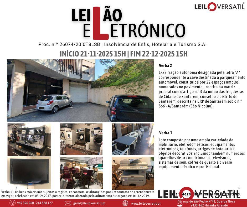 LEILÃO ELETRÓNICO | PROC. Nº 26074/20.0T8LSB | INSOLVÊNCIA DE ENFIS HOTELARIA E TURISMO, LDA.